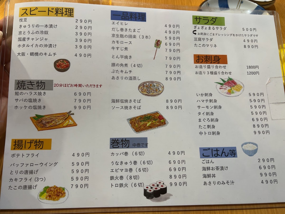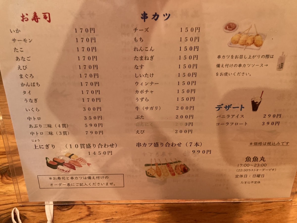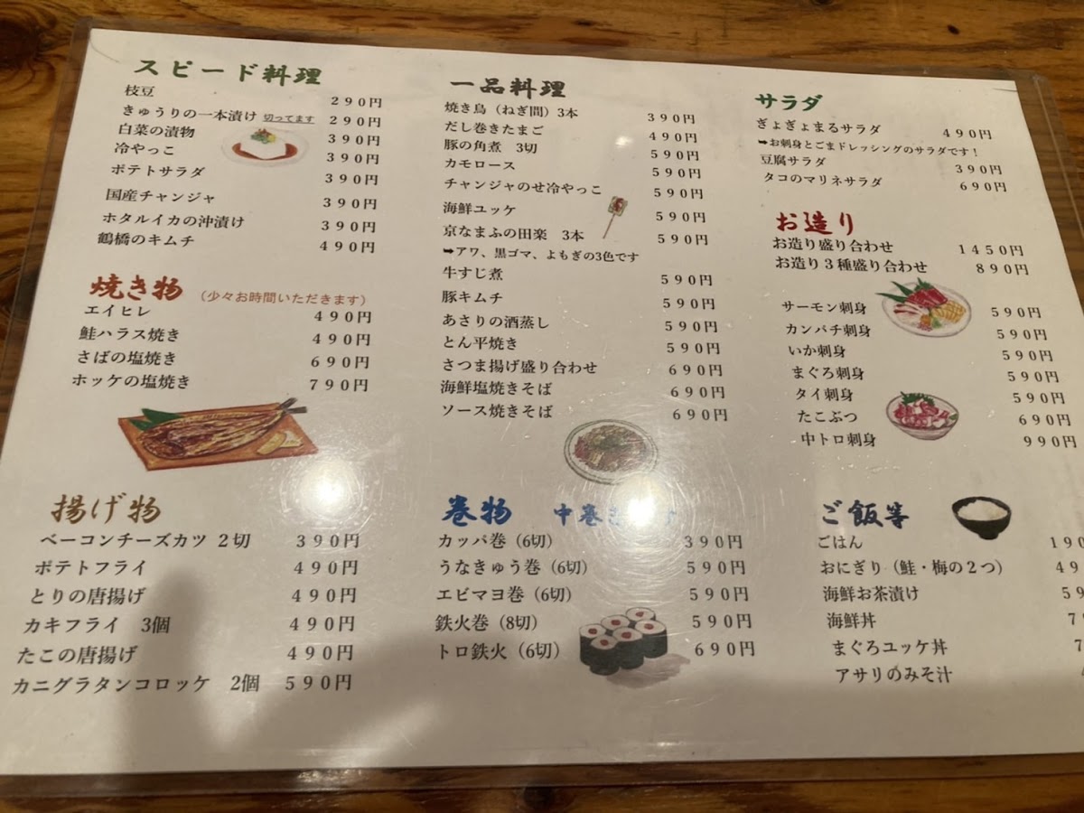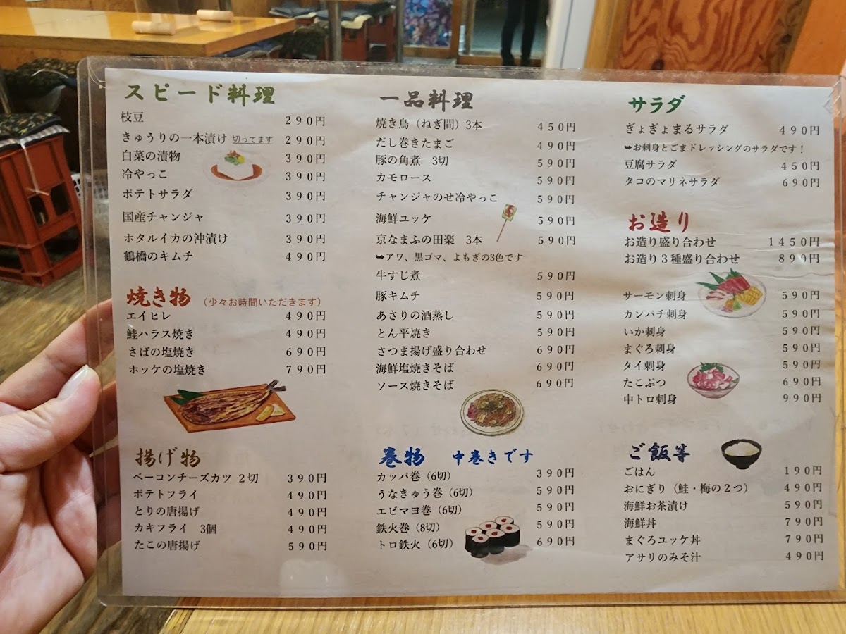 For something more adventurous, try the たこぶつ, a dish featuring fresh octopus, and the 酒盗, a traditional fermented seafood paste, perfect for those who want to explore unique flavors. The Tuns Roll is a delicious fusion roll that combines various ingredients for a satisfying bite, and the 焼鳥 is a grilled chicken skewer that’s always a crowd favorite. For a simple yet tasty dish, the 冷やっこ provides chilled tofu with a light and refreshing flavor.
